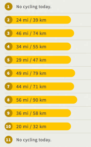 Looks like a good mix of cycling and rest days. (Where some of those rest days may involving hiking or some other activity.) If you’re keeping score at home, my tally of the mileage works out to be around 719 miles.